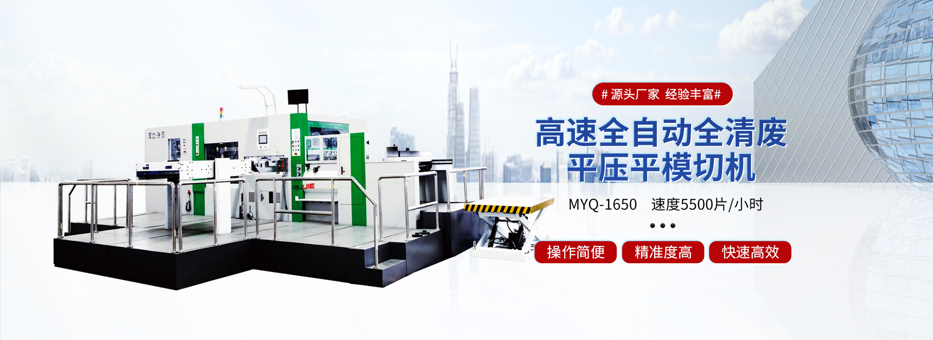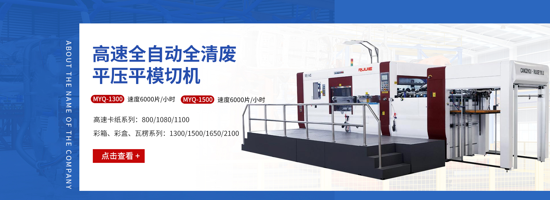 滄州瑞杰紙箱機械有限公司是一家集研發,制造,銷售為一體的生產系列模切設備廠家。我們擁有現代化的機械加工設備,秉承“以質量求生存,以科技促發展”的宗旨,先進的模切技術,給廣大客戶帶來更高的經濟效益。 公司自創立以來,勵精圖治,銳意創新,產品規格逐漸完善,質量不斷提升,市場持續擴大,產品遍布全國并出口世界102個國家。多次被評為河北省質量檢驗合格企業,產品質量放心企業。率先通過ISO9001:2008國際質量體系認證、歐盟CE認證,保證了產品質量的標準性和穩定性,確保更快速,便捷的為客戶提供高速率,低成本,自動化,高精度的印后加工設備。 瑞杰系列模切機,以“瑞杰”“恒盛” 為注冊商標。面對市場的瞬息萬變和客戶日益增長的需求,瑞杰人持續創新,以提高產品品質,完善服務,博采眾長,精心設計,制造每一件產品,更加堅定從客戶需求,客戶利益出發,成為客戶信賴的朋友。 Cangzhou Ruijie Carton Mac...